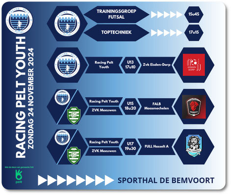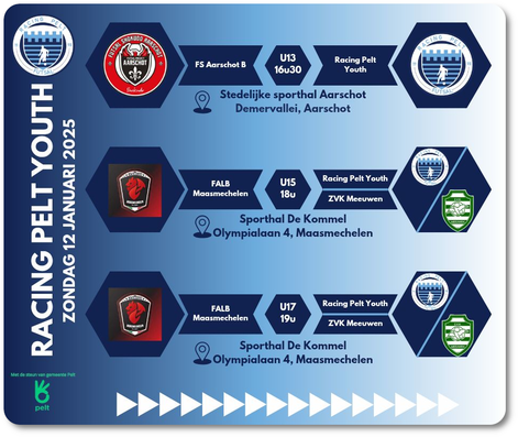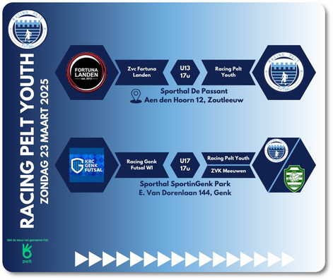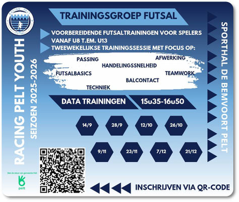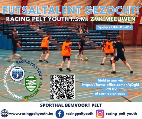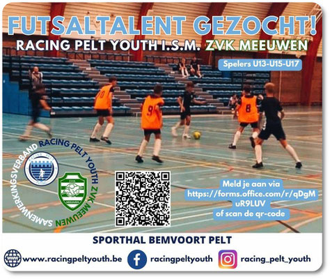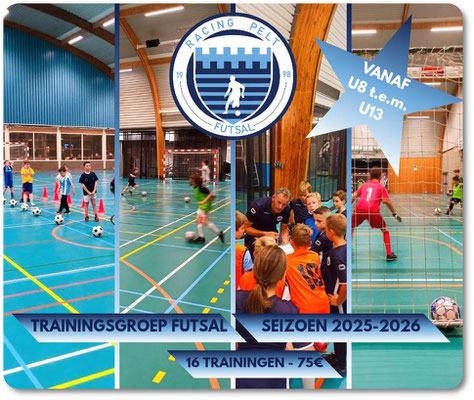 Bij Racing Pelt Youth zullen we volgend seizoen weer vol inzetten op jeugdopleiding futsal! Met onze trainingsgroep futsal (vanaf U8) en de competitieploegen U13-U15-U17 hebben we weer een breed aanbod zaalvoetbal voor alle leeftijden. Dit alles sportief begeleid door gediplomeerde jeugdtrainers.