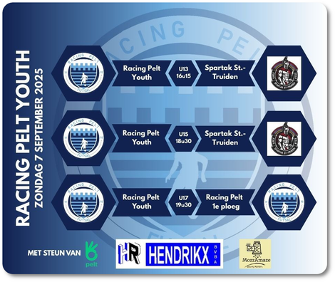 U13 en U15 oefenen tegen Spartak Sint-Truiden terwijl U17 het opneemt tegen de 1e ploeg van Racing Pelt.